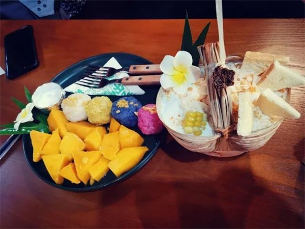 沒想到吧,糯米飯竟然還能和芒果組成新cp。這道具有泰式風(fēng)格的美食,既可以是一道主食也可以是一道特色甜點,粉色、藍紫色、白色、黃色的糯米飯團被大塊的芒果團團包圍,光是看著就非常有食欲,先來一勺米飯配上芒果,吃出芒果糯米飯的原汁原味,之后再澆上備好的椰漿,即使是在冬天,你也能吃出一種夏日在芭提雅的度假之感。