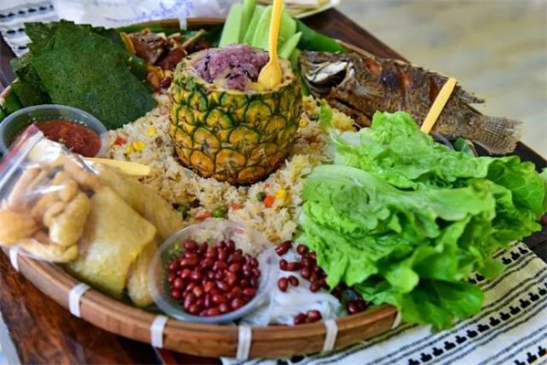 大筲箕上鋪上一層芭蕉葉,將傣族美食集合葷素搭配,加上食材染出的彩色糯米飯和水果,擺出各種精美的造型,用手抓著品嘗,整頓飯都吃得十分獨特。古樸美味的味蕾盛宴擺脫了傳統(tǒng)餐食的繁文縟節(jié),用原始樸實的方式呈現(xiàn)在人們面前,頃刻間便能感受到突破桎梏的愉悅,與美味食材親密接觸,回歸質(zhì)樸醇厚的飲食文化之中。