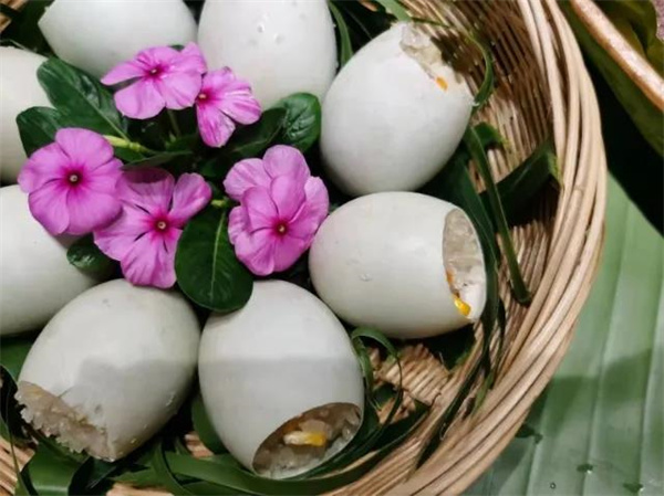 將糯米塞進雞蛋里,將簡單的食材吃出一種精致和儀式感。底部的蛋黃托住上層的糯米和蔬菜,如果整個剝開看,就像長在雞蛋上的一株白蓮花,一口下去,咸咸糯糯,蔬菜丁的甜加糯米飯的香再配上雞蛋的咸香,有層次地在口腔中擴散,一口接一口,當(dāng)你回過神來,手里卻只剩下一個蛋殼了。