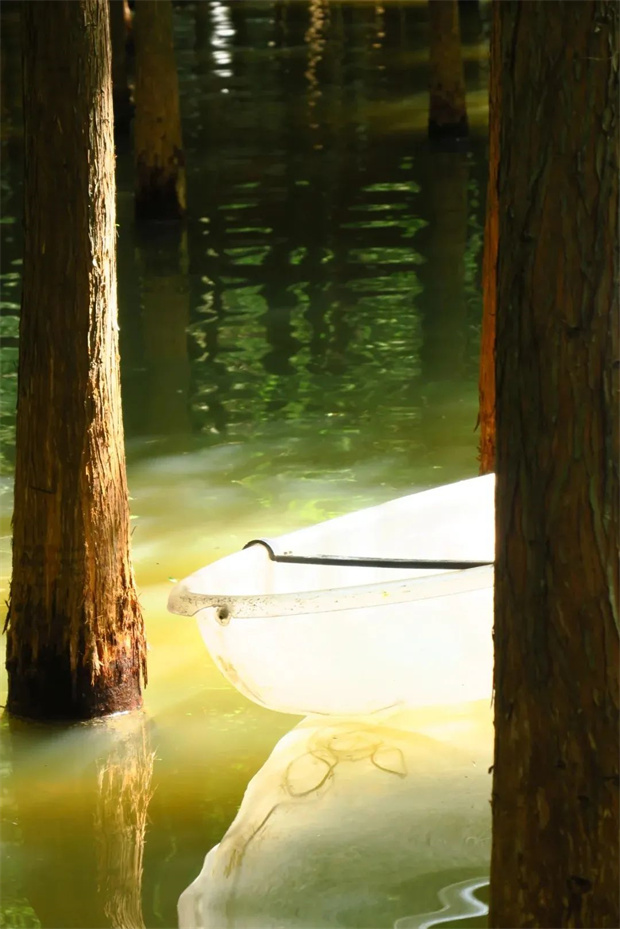 四點鐘的光影魔術:下午四點,陽光褪去正午的灼熱,斜斜穿過水杉枝葉的間隙,在船身、水面、發(fā)梢與衣角間灑下斑