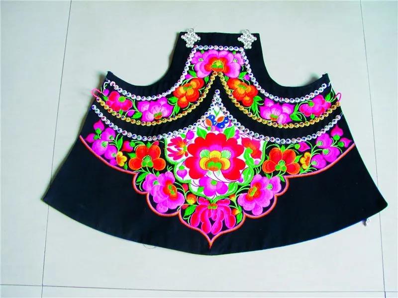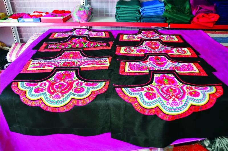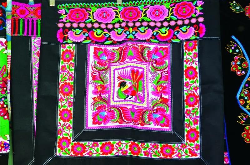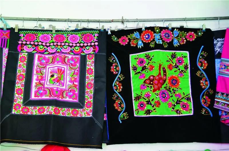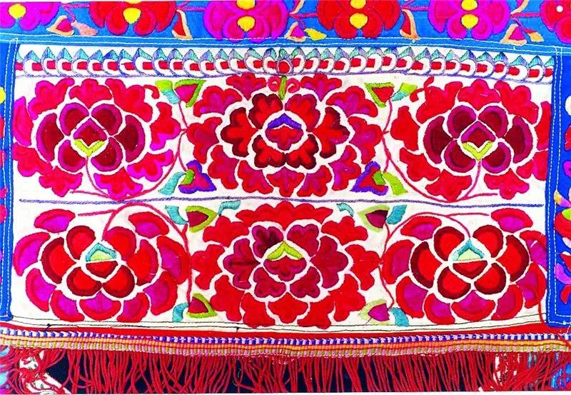 在古黑村,衣服和生活用品上繡滿了生活中隨處可見的景物,這些景物經過概括、變形、夸張,采用挑花、扣花、十字繡、平繡等手法,“點、線、面”交融。村里的男性常年穿著麻布或棉布的高領無袖對襟鑲邊馬褂。女性上衣前短后長,衣尾至膝后彎,袖、坎、肩、尾繡有彩色花邊,前佩與衣尾同長的圍腰,腰系繡花腰帶,整套衣服從領口、衣襟、袖口,前前后后、上上下下都繡滿了各式各樣的花紋和圖案,鑲滿各式各樣的花邊。