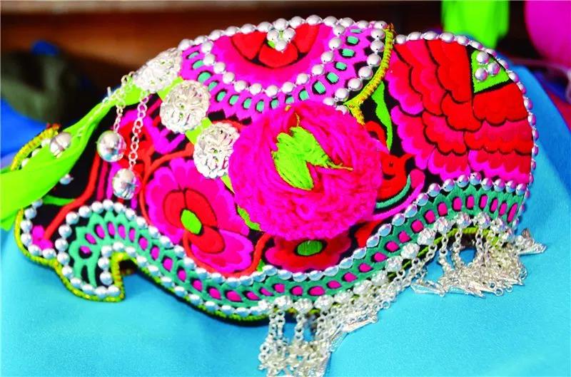 武定彝族女子頭戴雞冠形的“雞冠帽”,帽檐左右兩側各裝飾一朵馬櫻花,帽檐上繡滿了盛開的牡丹,帽沿周邊用許多銀泡鑲嵌,帽辮用黑毛線制成,配以銀器自頭頂懸垂至腰間,如同臉頰兩邊長發傾瀉而下。