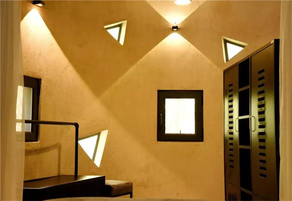 值得一提的是,每間房間設(shè)計(jì)師都在墻壁上,設(shè)計(jì)了三角形狀的窗戶,這些三角窗供給房間采光的同時(shí),本身以三角的形狀給人奇妙夢(mèng)幻之感。床的正上方,留有鏤空的房頂。所有休息區(qū)域的取光,都是依靠鏤空的房頂自然供光。正因如此,在每一個(gè)星河燦爛的夜晚,伴隨著房間舒緩輕柔的音樂(lè),在滿天星月的陪伴下,安然入夢(mèng)。